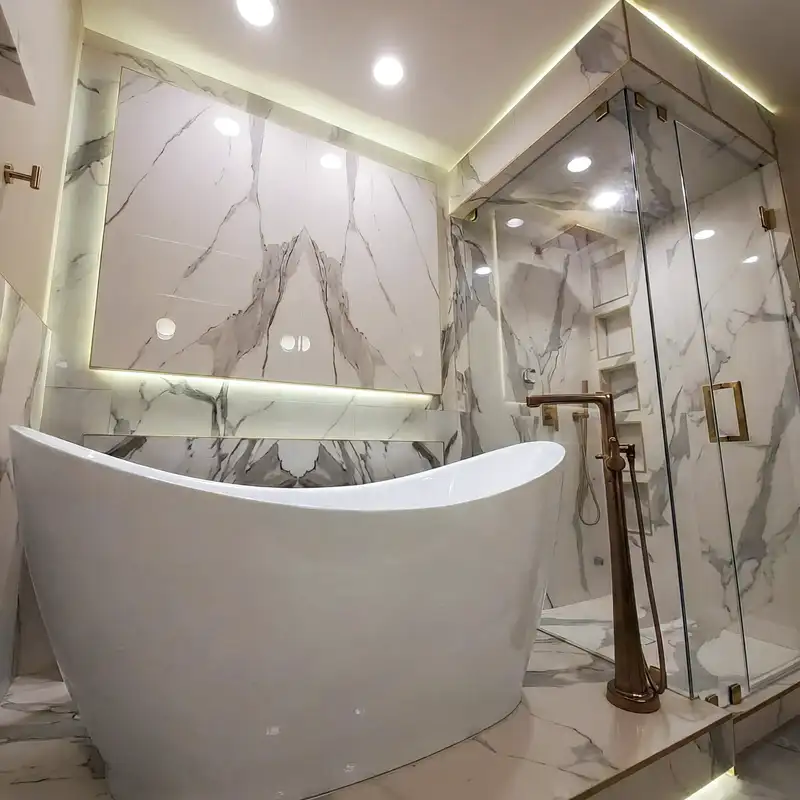 We update plumbing and electrical to code, then install industry-leading waterproofing systems (like Hot Mop or Schluter). Our skilled artisans lay tile with precision and install your new amenities.